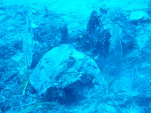 Foto subacquea: visione ravvicinata dei blocchi di ossidiana collocati a circa 15 metri di profondità in località Grotta Bianca a Capri.